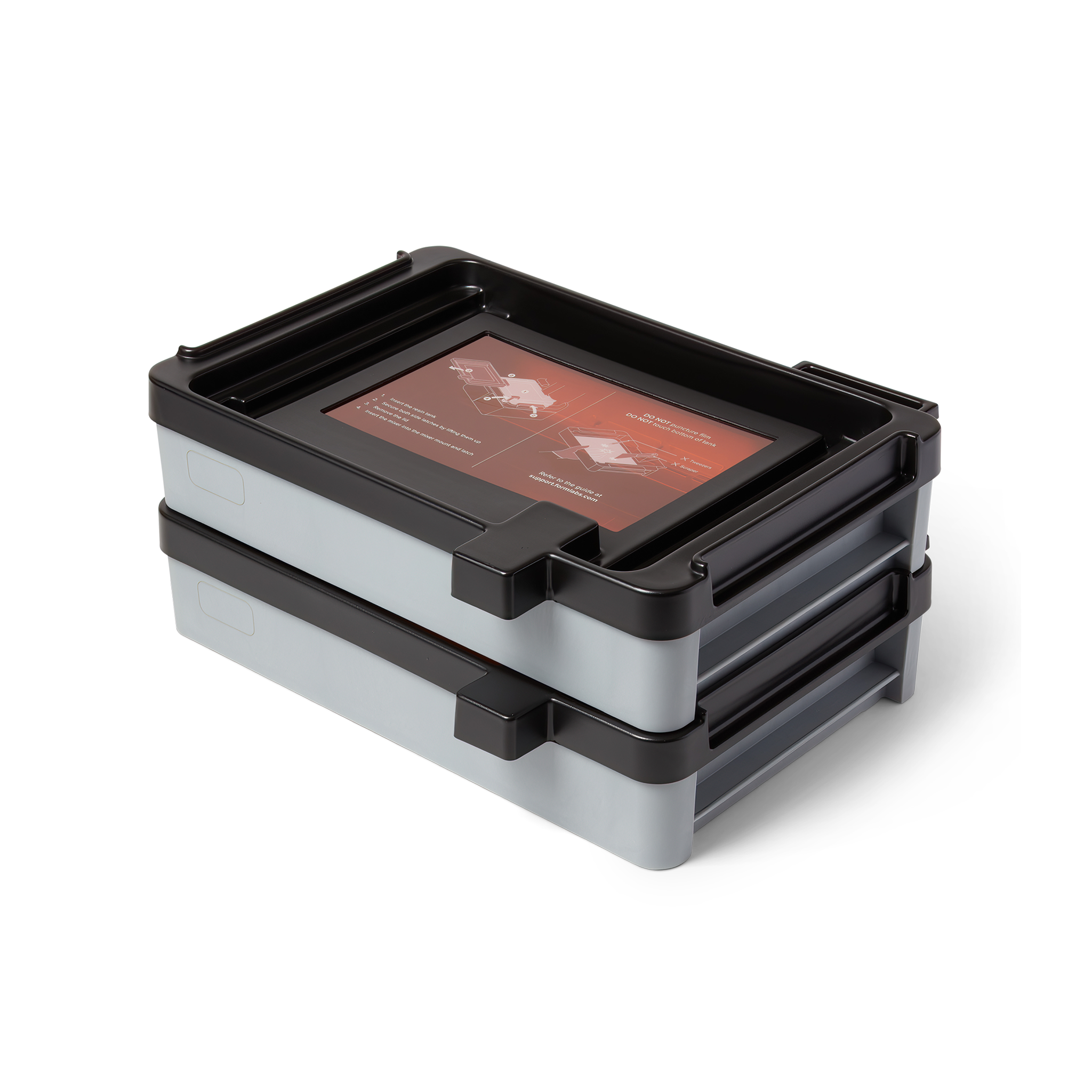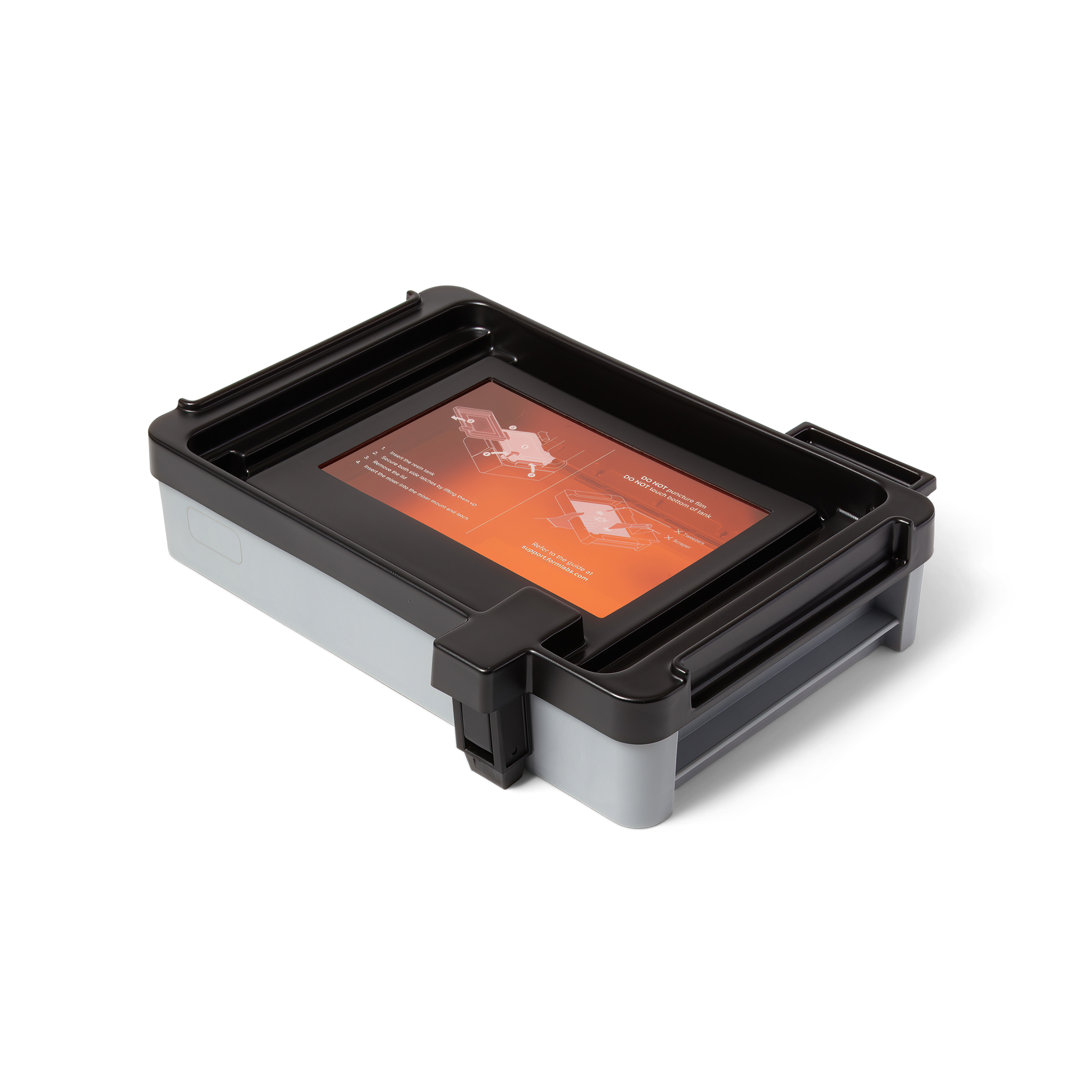 As far as the container itself goes, it is generously oversized, has an easy-pour spout to help prevent accidental spills, and its cover doubles as a reusable lid with a stackable design. The Form 4 3D Printer uses simple latches to secure the tank, and the printer's pre-calibrated Leveling Sensor ensures it is flat for accurate liquid resin measurement and distribution.